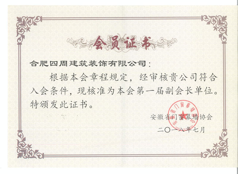 安徽省門窗幕墻協(xié)會(huì)會(huì)員證書(shū)